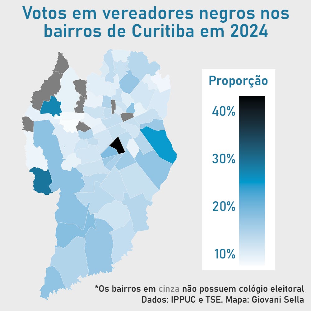 A partir o mapa, é possível perceber que bairros periféricos da região sul, sudoeste e centro-oeste de Curitiba votaram mais em pessoas negras. Bairros considerados nobres da região norte, com exceção do centro, votaram menos em vereadores pretos e pardos.